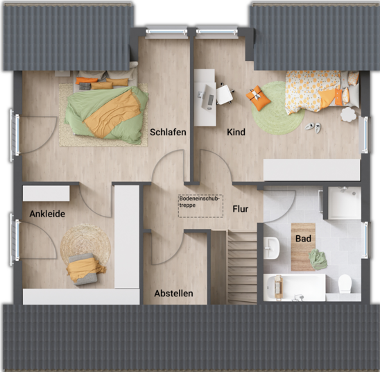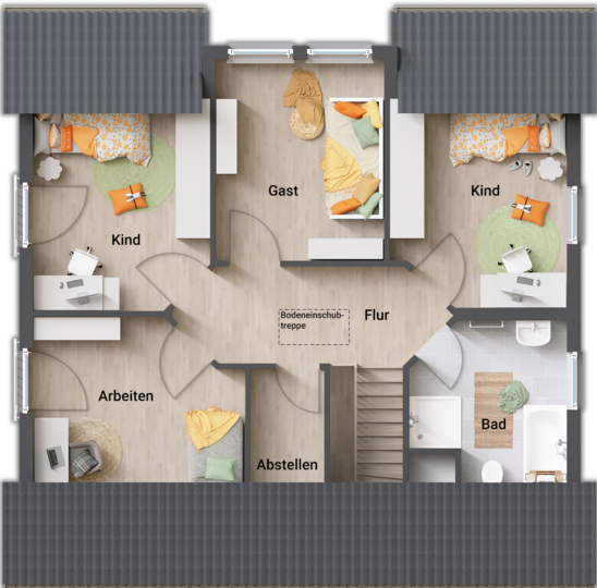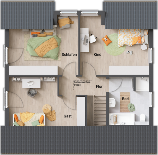 Oben geht’s flexibel weiter: Drei große Zimmer kannst du als Schlaf-, Kinder- oder Arbeitszimmer nutzen. Und wenn du mehr brauchst, lässt sich das Haus problemlos auf bis zu sechs Zimmer erweitern.