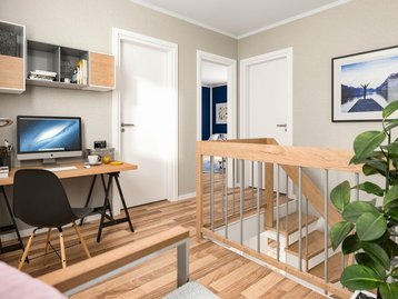 Oben erwartet dich ein großzügiges Kinderzimmer, ein modernes Bad mit cleverem Grundriss – und als Highlight eine lichtdurchflutete Galerie. Sie schafft Offenheit, verbindet Räume und gibt deinem Zuhause einen ganz besonderen Charakter. Optional lässt sich die Galerie im Handumdrehen auch in eine drittes Zimmer umfunktionieren. Ganz wie du willst!