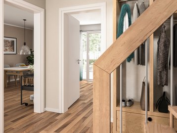 Diese Stadtvilla verwirklicht Paaren oder Familien den Traum vom urbanen Lebensstil zu mietähnlichen Konditionen. Die zweigeschossige Bauweise schafft viel Wohnraum im Obergeschoss und bietet Gestaltungsfreiräume bei der Einrichtung. Dachschrägen, die den Platz für Schränke und Stauraum wegnehmen, gibt es hier nicht!
