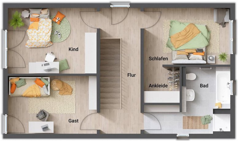 Auch im Obergeschoss empfangen Sie drei geräumige und lichtdurchflutete Zimmer. Der begehbare Kleiderschrank im Schlafzimmer ist ein echtes Raumwunder und sorgt für Ordnung in ihrer Ruheoase. Das modern designte Badezimmer überzeugt nicht nur mit seiner Wohlfühlatmosphäre, sondern auch mit cleveren Ablage- und Stauflächen.