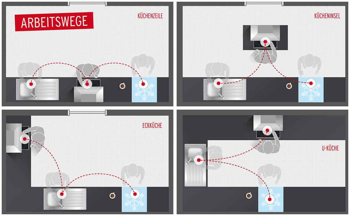 Die Laufwege zwischen den verschiedenen Arbeitsbereichen Kühlschrank, Kochfeld und Spüle sollten kurz gehalten werden, um möglichst ergonomisch in der Küche arbeiten zu können. Deshalb sollte die Küche effizient geplant werden. Zum Vergleich: In einer Küche, die nicht ergonomisch geplant wurde, fallen Laufwege von etwa 32 Minuten an, während in einer ergonomisch geplanten Küche diese Zeit nur bei ca. 18 Minuten liegt. Dies verdeutlicht, wie viel Zeit sich durch eine nach ergonomischen Maßstäben geplante Küche einsparen lässt.