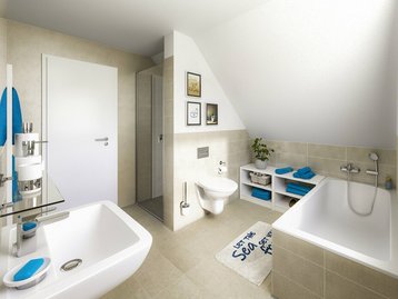 Das Flair 113 bietet alles, was ein Massivhaus gemütlich macht. Im Erdgeschoss betreten Sie ein geräumiges Wohn- und Esszimmer, eine Küche mit genügend Freiraum, ein Gäste-WC und einen Hauswirtschaftsraum mit ausreichend Platz für Waschmaschine und Co.