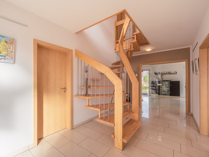 Im Erdgeschoss erwartet dich ein großzügiger Eingangsbereich mit integrierter Garderobe, von dem aus eine zweiflügelige Glastür in den Wohn- und Essbereich führt. Die angrenzende moderne Küche ist zum Wohnen geschlossen und das Gäste-WC und ein Hauswirtschafts-Raum komplettieren die untere Ebene. Eine moderne Holztreppe führt Sie nach oben, wo eine große lichtdurchflutete Galerie Sie in Empfang nimmt. Zwei Kinderzimmer, ein Schlafzimmer sowie ein modernes Bad lassen keine Wünsche offen.