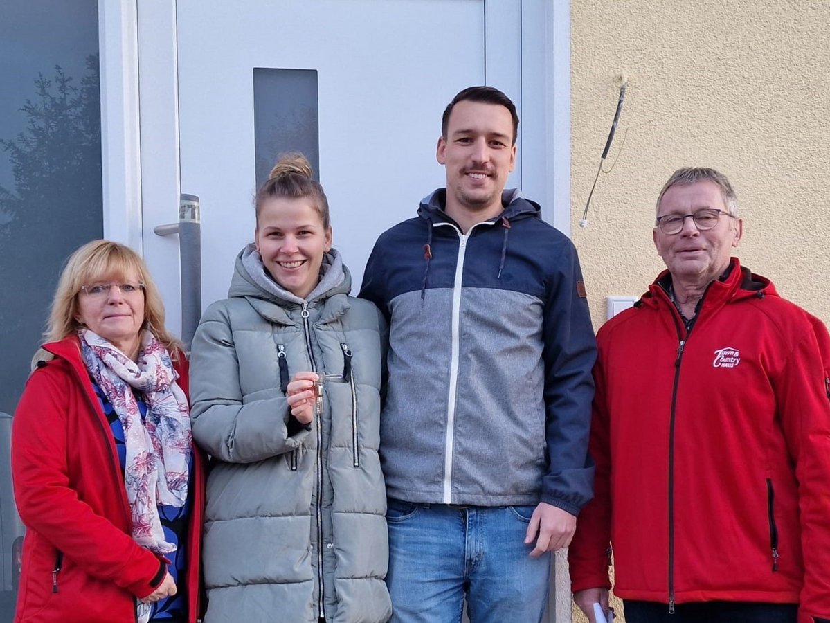 Unsere Hauskaufberaterin Babette Beier gratulierte gemeinsam mit Oberbauleiter Winfried Jäger zu diesem besonderen Ereignis. Das Einfamilienhaus mit dem schönen Satteldach und den bodentiefen Fenstern ist ein echter Hingucker!