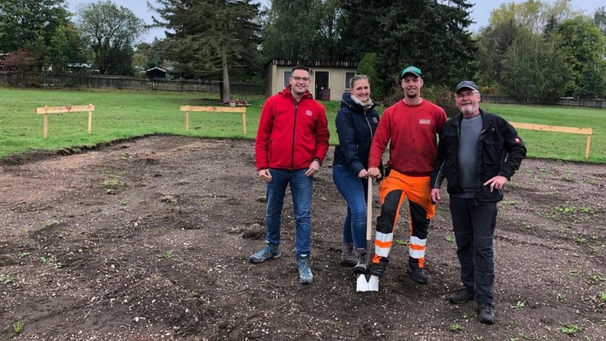 Gemeinsam mit Bauleiter Raphael Gerling und dem Tiefbauer traf sich die Familie zum feierlichen ersten Spatenstich auf ihrem schönen Grundstück!