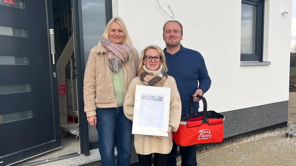 Am 18.12.2024 war für unsere Bauherrenfamilie H. der große Tag gekommen: Die feierliche Übergabe ihres schicken "Stadthaus Flair 152", das in den vergangenen Monaten im schönen Bad Staffelstein entstanden ist. Mit dabei: Unsere Geschäftsführerin Sandra Herrmann (links).