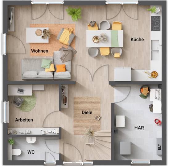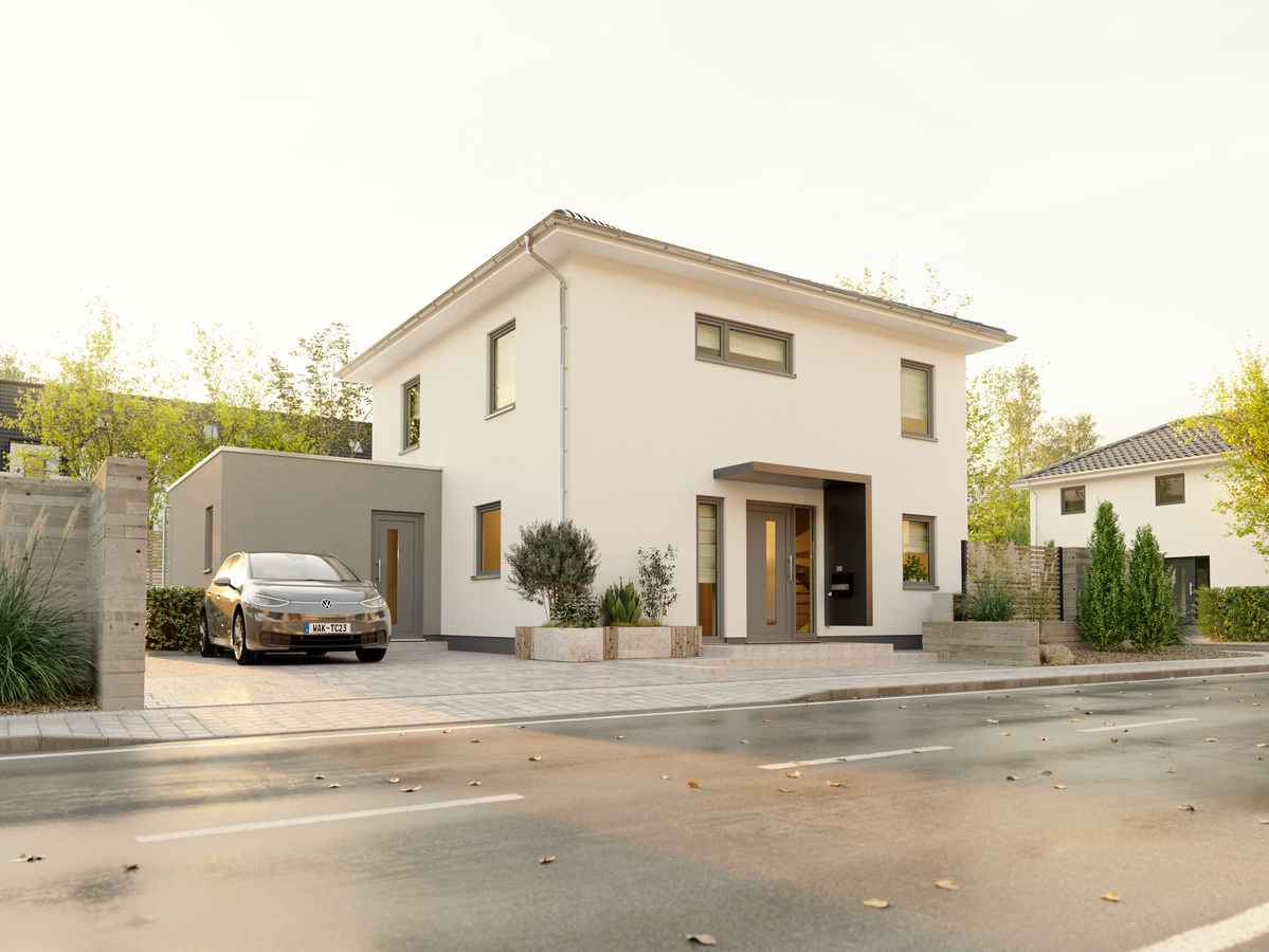 Der Flair 124 verbindet klassischen Stadthausstil mit modernem Wohnkomfort. Die kubische Form und klare Linien prägen das Design, bodetiefe Fenster auch im Obergeschoss sorgen für lichtdurchflutete Räume. Der großzügige Wohn- und Essbereich bildet das Herzstück des Hauses und führt direkt auf die Terrasse - Dein grünes Wohnzimmer. Im Obergeschoss bieten drei helle Zimmer Platz zum Schlafen, Spielen, Arbeiten oder für Gäste. Die Küche lädt zu gemeinsamen Kochabenden und entspannten Familienfrühstücken ein.