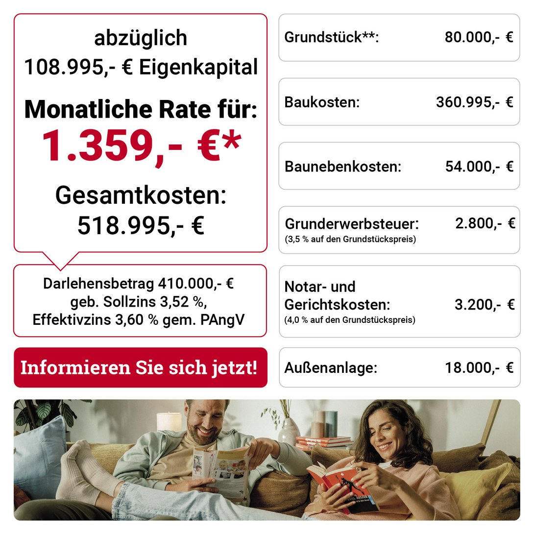 **Die Beschaffung / Vermittlung eines Grundstückes ist nicht Bestandteil dieses Angebotes. Der im Beispiel genannte Grundstückskaufpreis hat lediglich exemplarischen Charakter. Alle Daten basieren auf dem Stand vom 18.12.2023.